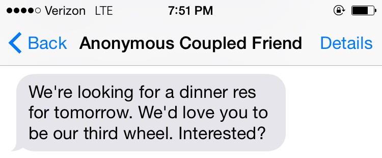 Proposals You Get When You’re Single In Your 30s February 7, 2015Dating/Single Life, Friendsbeing single, single life, third wheelEmily For the record, I accepted. Best offer I’ve had in a while. (I’m not sure he knows yet that he’s paying). Share this: Click to share on X (Opens in new window) X Click to share on Facebook (Opens in new window) Facebook Like Loading... Related