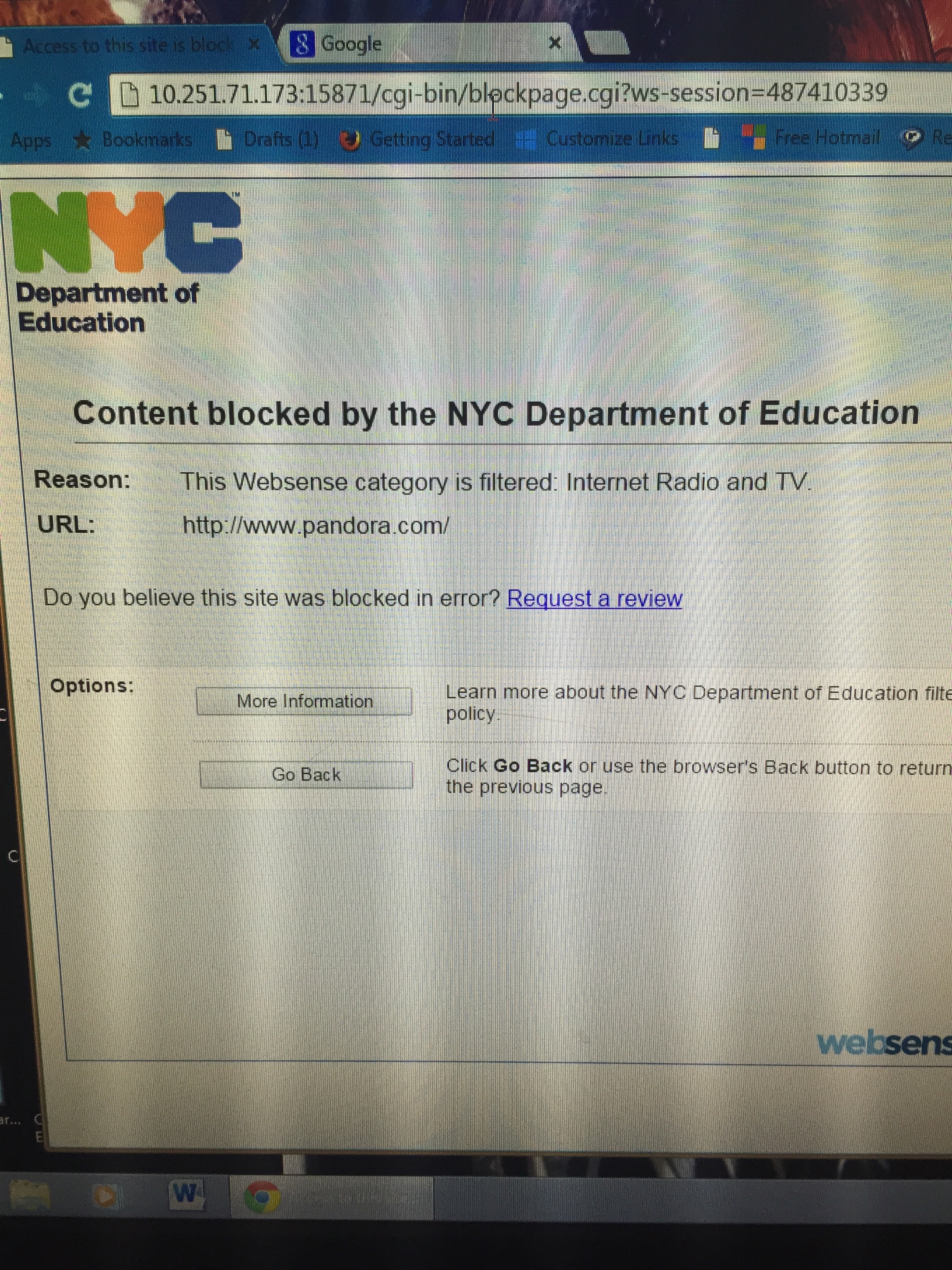 Today the NYC Department of Ed added Pandora and Netflix to their list of banned websites. Already on this list is every single shopping website, including Amazon.com, where all of us teachers have our class supply wish lists.