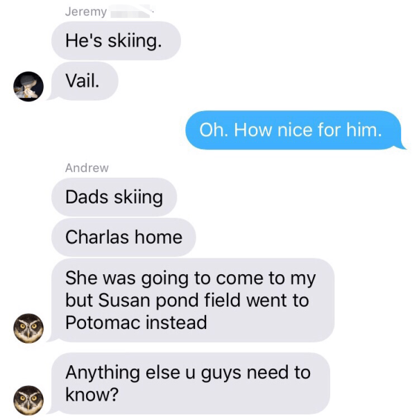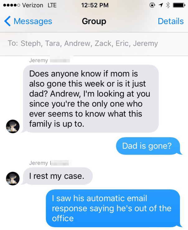 At Least Andrew Knows March 10, 2016Familycommunication, family, family dynamics, parentsEmily As usual, Andrew (my brother-in-law) is the only one who knows where our parents are. Share this: Click to share on X (Opens in new window) X Click to share on Facebook (Opens in new window) Facebook Like Loading... Related