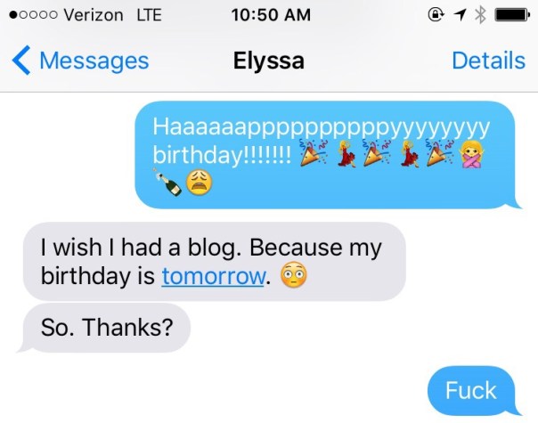 Holiday Weekends Throw Me Off May 28, 2016UncategorizedEmily It’s fine. She’s only one of my best friends and the person I spend more time with than anyone in the world. Share this: Click to share on X (Opens in new window) X Click to share on Facebook (Opens in new window) Facebook Like Loading... Related
