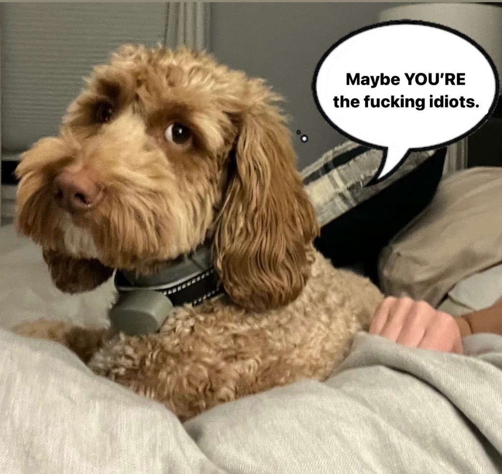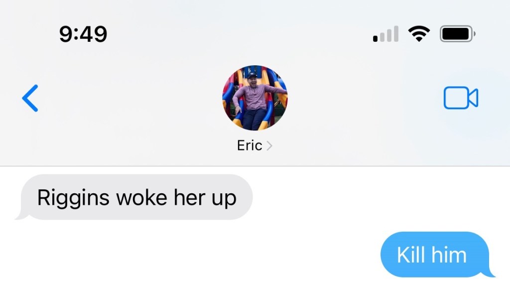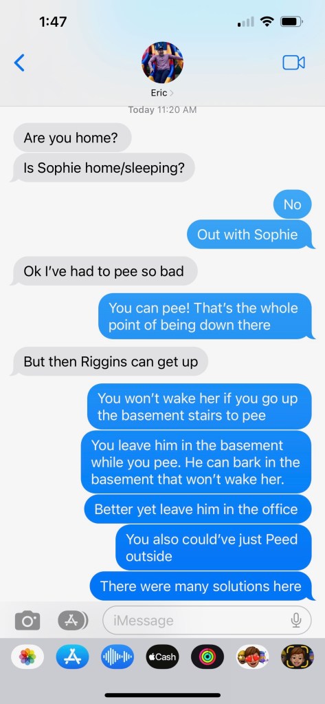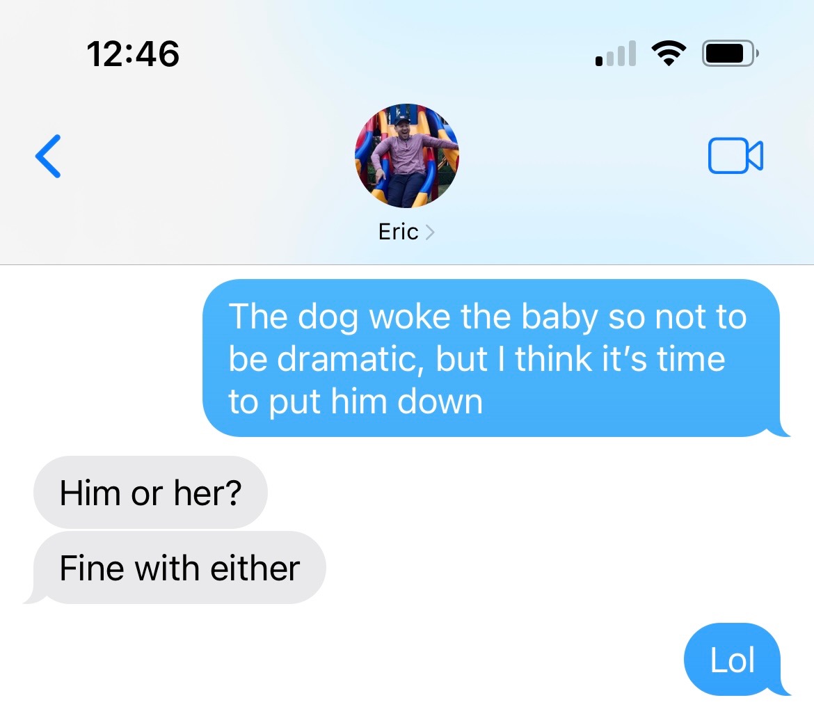 Fast forward a few months. The baby is born. The dog barks. The dog wakes the baby. The baby screams. I contemplate murder. Rinse, wash, repeat– every day, all day, leading up to present day. Eric and I send no less than 10 texts a week on this exact topic. Sometimes I can keep a sense of humor about it: