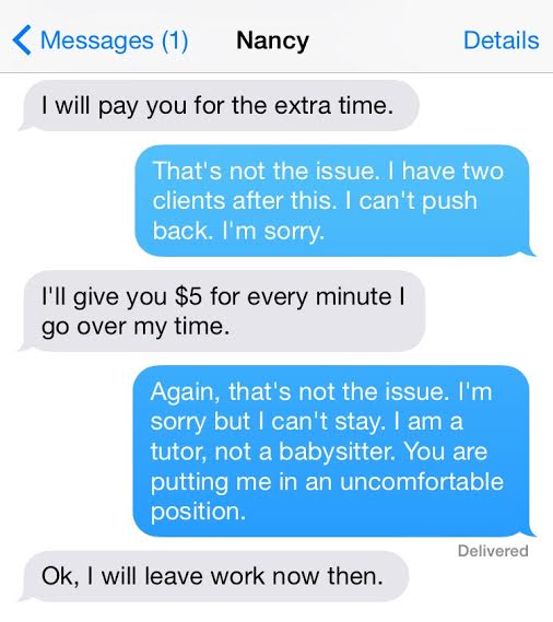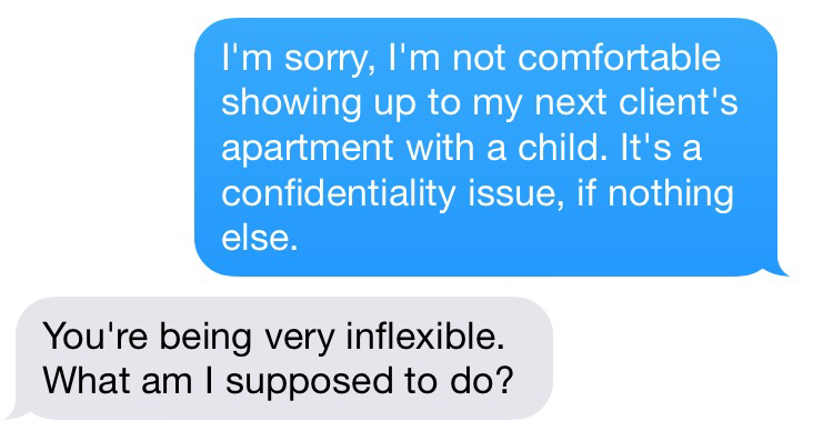 She then asked if I could take her daughter with me to my next client. (I’m not posting that text because in it she uses her daughter’s name, and I try to protect the innocent children). Again, in case you missed how ABSURD this is– SHE ASKED ME TO BRING HER CHILD TO MY NEXT CLIENT’S APARTMENT. No, she does not know my next client.