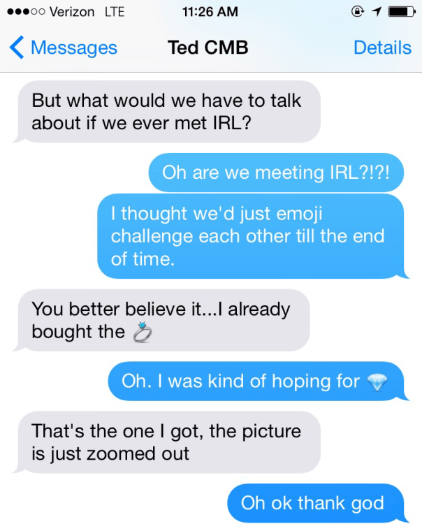 We switched from app chatting to iMessage, so you know it’s getting serious. Also because he proposed.