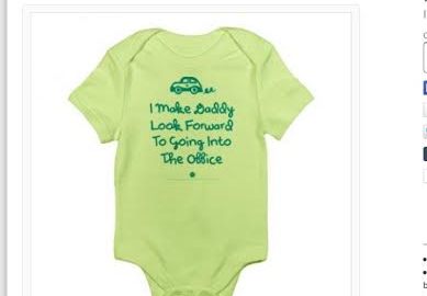 But there was one that was just freakin PERFECT, because, as much as my sister loves being a mom and loves that little chicken mcnugget, she mutters the words “Being a lawyer is so much easier than taking care of an infant” at a rate of 3 times per minute whenever I’m there. So when I saw the onesie that read “I make Daddy look forward to going into the office,” I thought, “Oh! Perfect! I just need the Mommy version!”