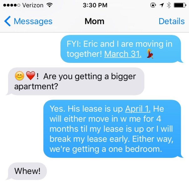 But still, it’s always so insulting when I do speak to my mom on the phone and she makes a point to ask me if there are any major developments in my and Eric’s relationship that she should know about– clearly implying that if some kind of major event WERE to occur, she wouldn’t even know about it. Which is just insane.