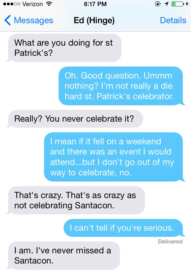 Me: “Ok, let’s start over. Hi, I’m Emily. Are you a rapist?”