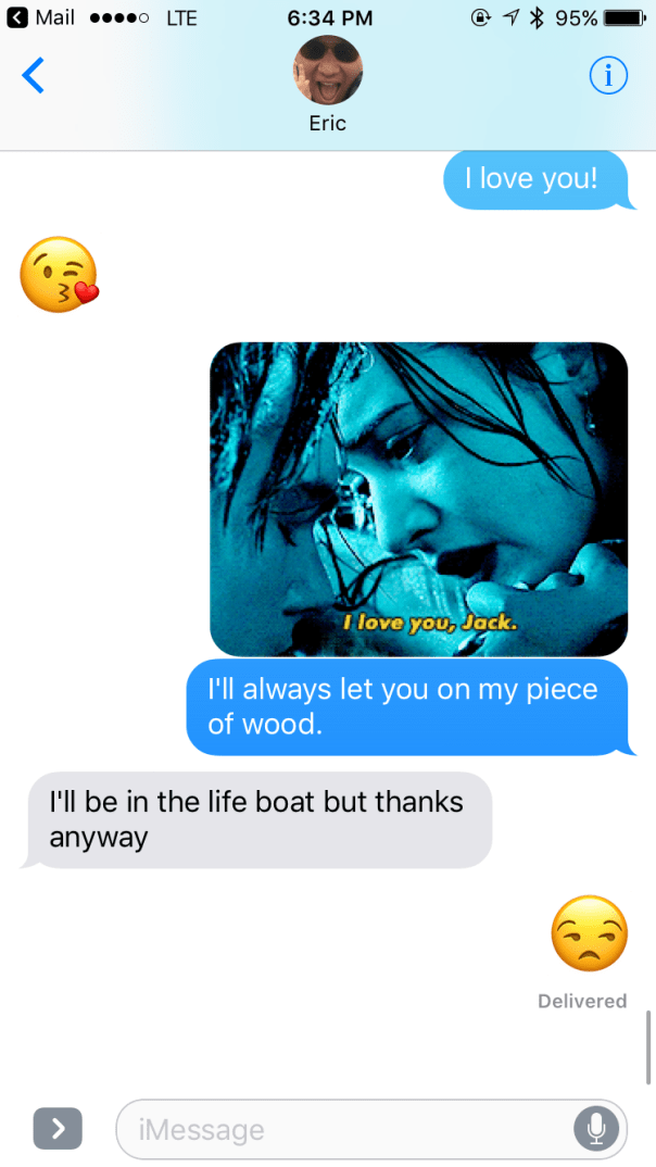 Romance, Part 4 January 6, 2016Dating/Single Life, Relationshipshealthy relationships, love, relationships, titanicEmily “I’m getting on that piece of wood with you.” — Eric, making it very clear what he will do should we find ourselves in the same situation as Rose and Jack after the Titanic sank.