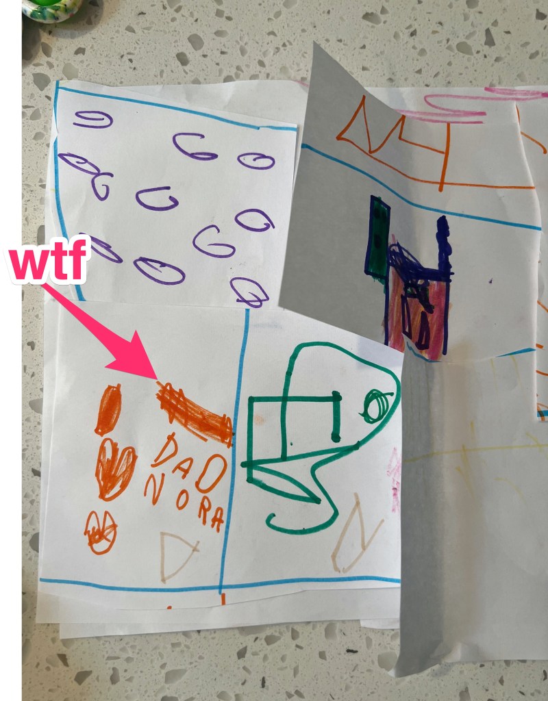Nora: “It’s just that I thought I was gonna make just a messy scribble scrabble picture so I made it for you but then I started working hard and the picture turned out really beautiful so I made it for Dad instead.”