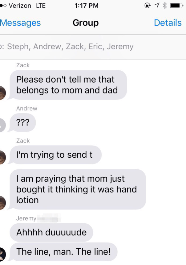 A few hours later, while Eric and I were at the dinner, Zack arrived at the house and immediately sent this to the sibling text chain: